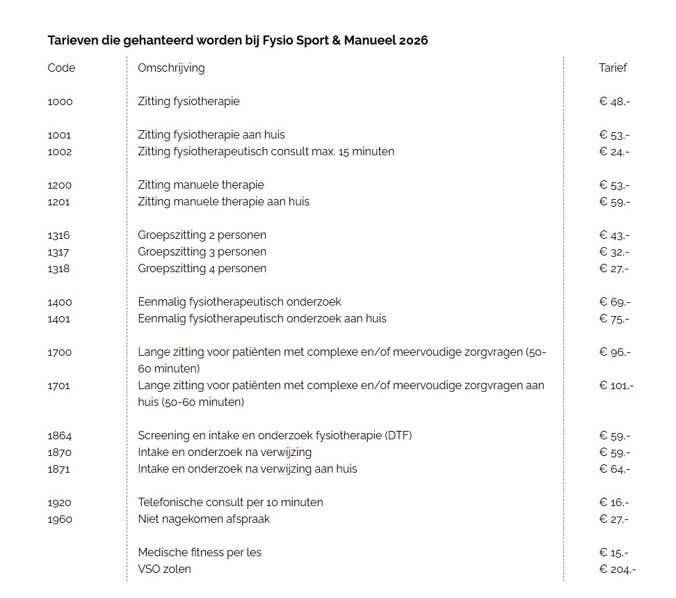 Tarieven die gehanteerd worden bij Fysio Sport & Manueel 2026